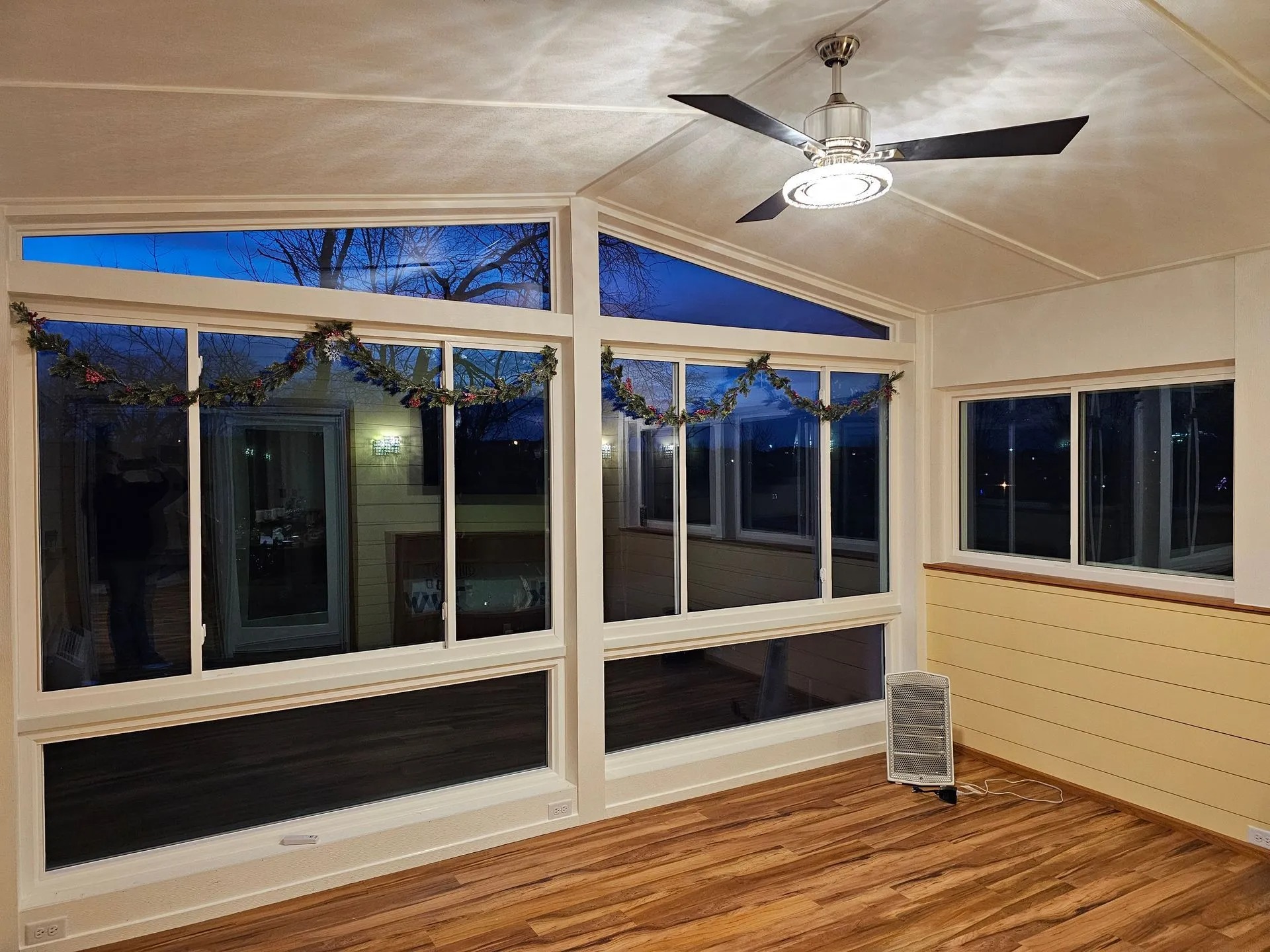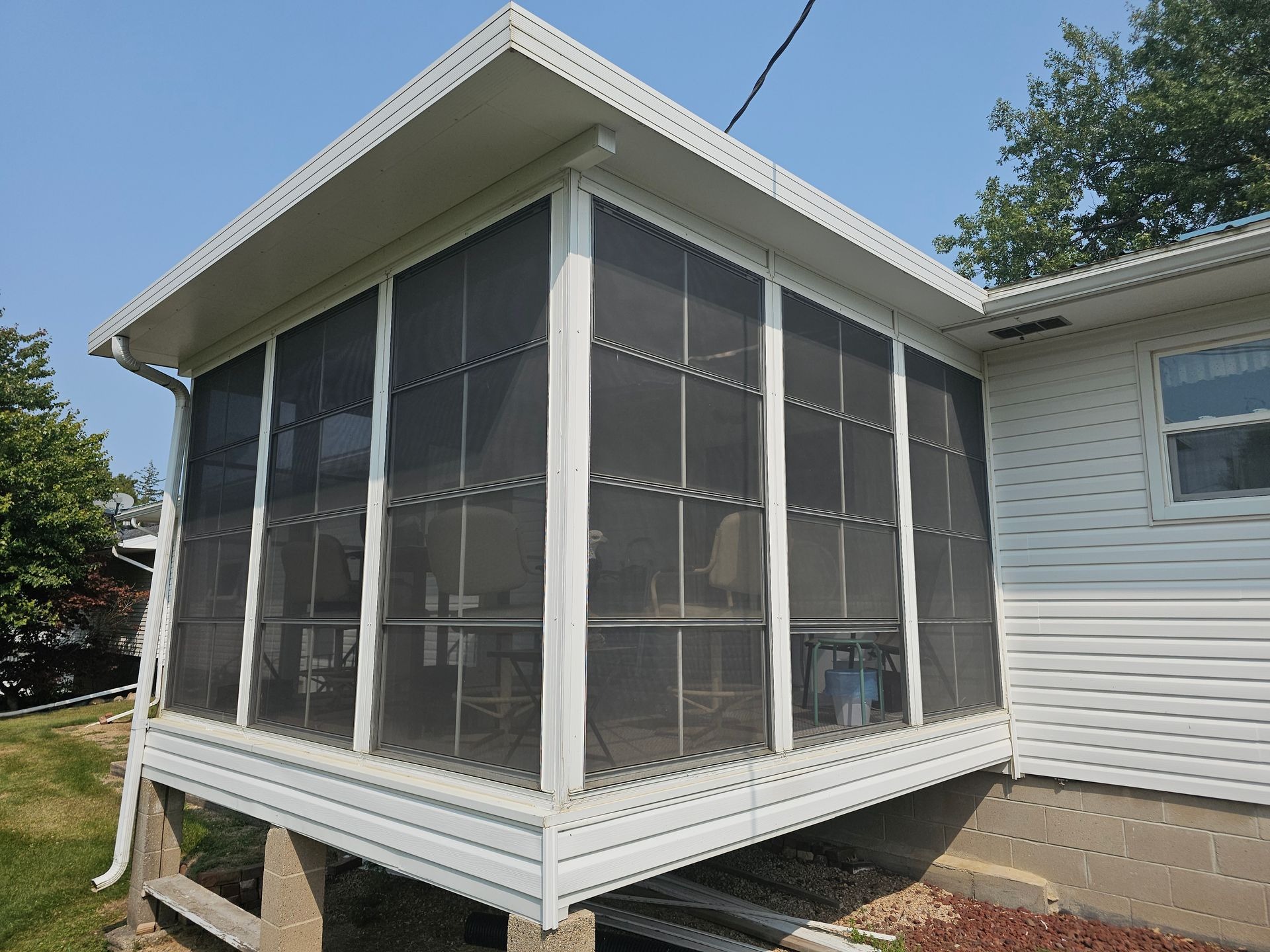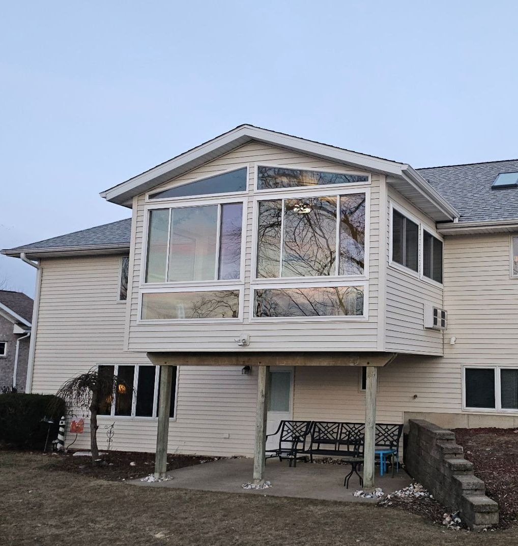 A screened porch converted into a fully insulated patio room with windows for year-round comfort.